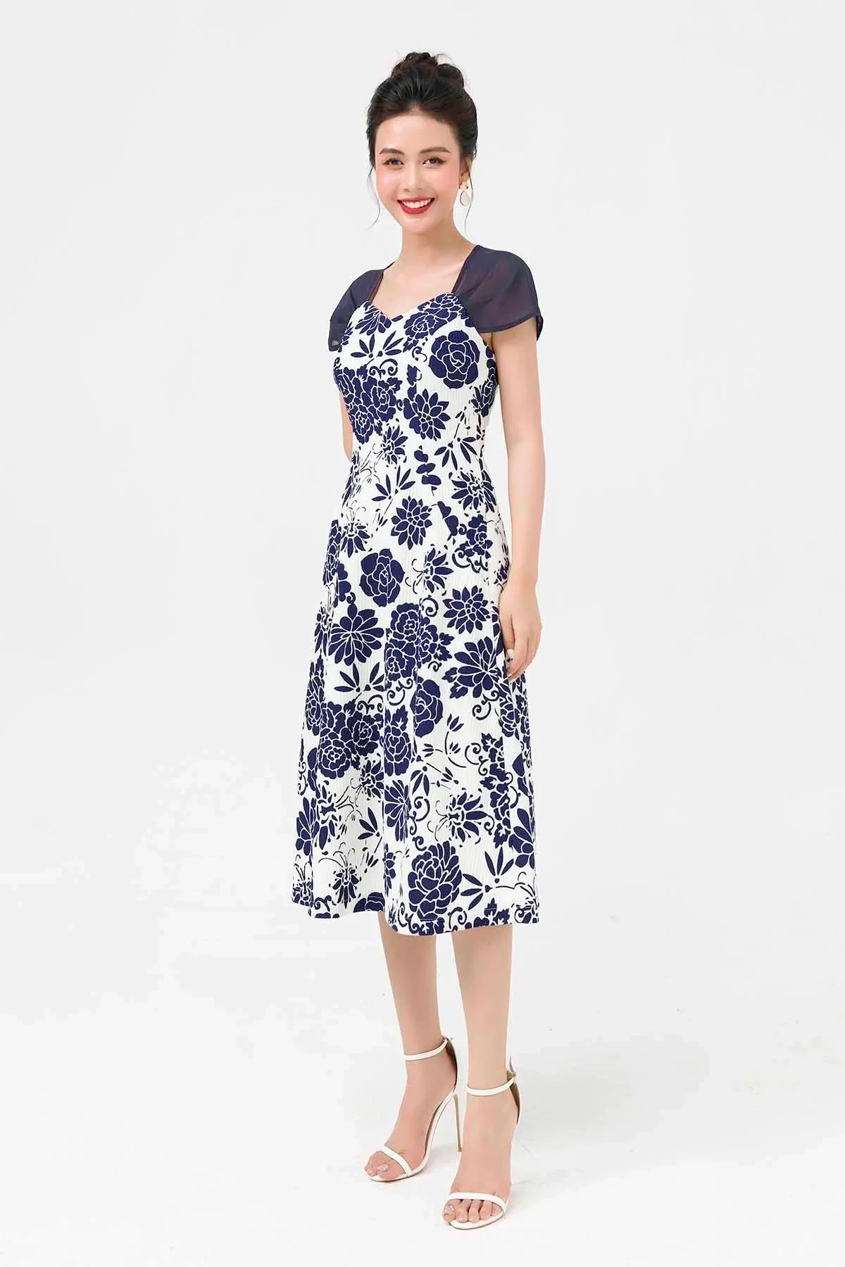 thienafashion.com - Dress Line A coordinating sleeves- Blue and white flowers multi color